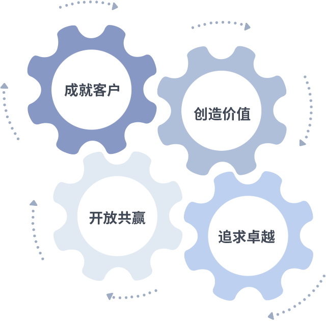 成就客户是一切决策的出发点,,,创造价值是衡量所有工作的标准,,,,追求卓越是我们做事做人的态度,,开放共赢是我们的格局也是最终的结果。。。价值观的齿轮环环相扣,,,,推动着组织里的每个人不断向前。。。。